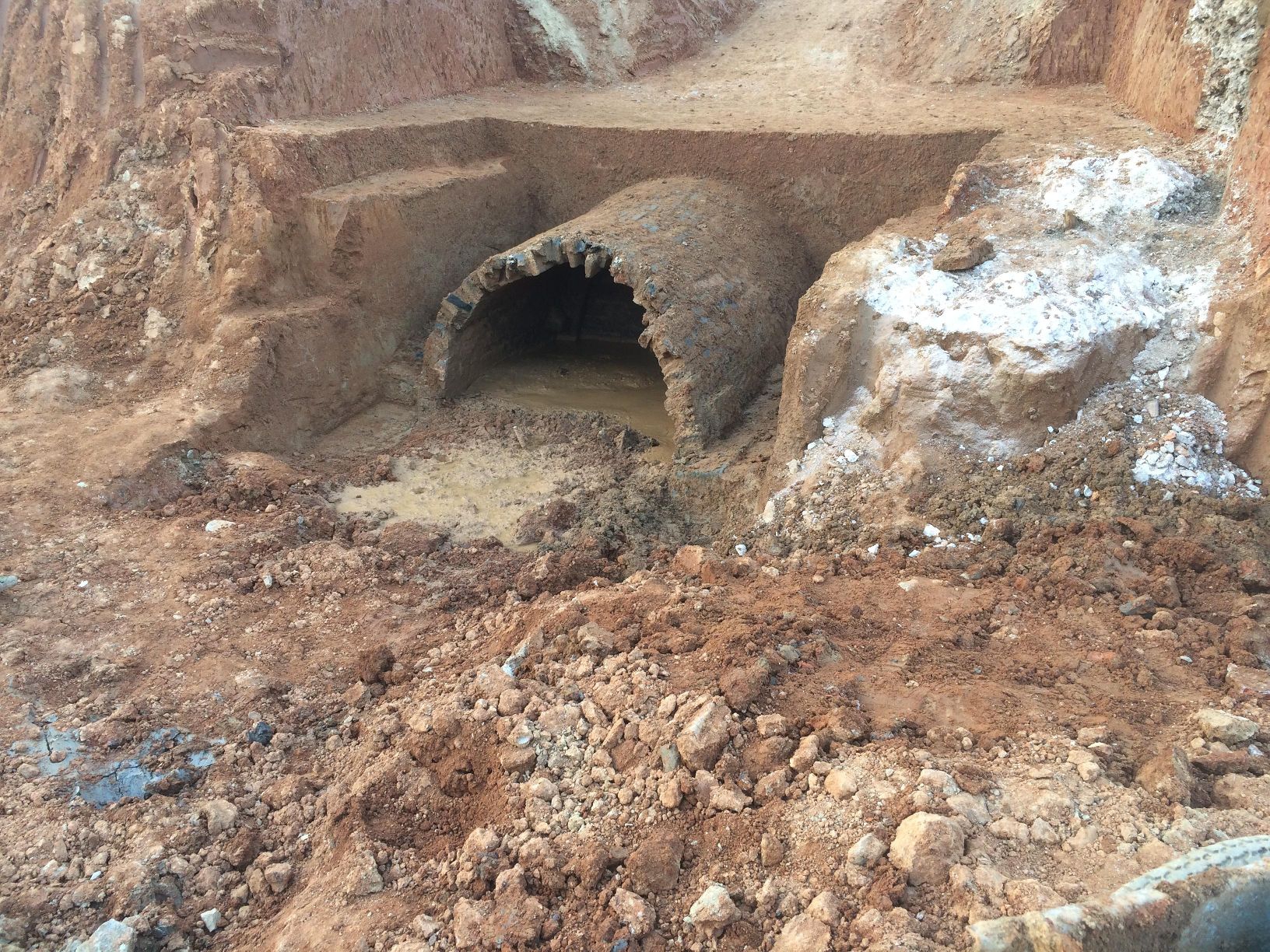 古墓是在進(jìn)行1#地下室土方開(kāi)挖作業(yè)時(shí)發(fā)現(xiàn)的,中鐵二十局集團(tuán)有限公司施工人員在使用反鏟挖掘機(jī)開(kāi)挖1#地下室第二層土方時(shí)鏟斗破開(kāi)了古墓的拱頂,古墓內(nèi)部流出了大量的積水,但因頂部構(gòu)造相似,當(dāng)時(shí)未能確定是古墓還是舊人防設(shè)施。